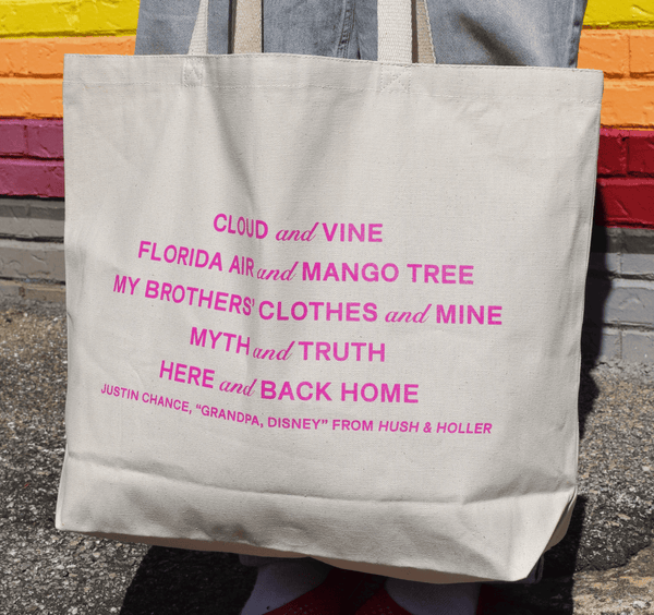 Limited edition Hush & Holler tote bag with quote by contributor Justin Chance from his H&H essay, “Grandpa, Disney”.