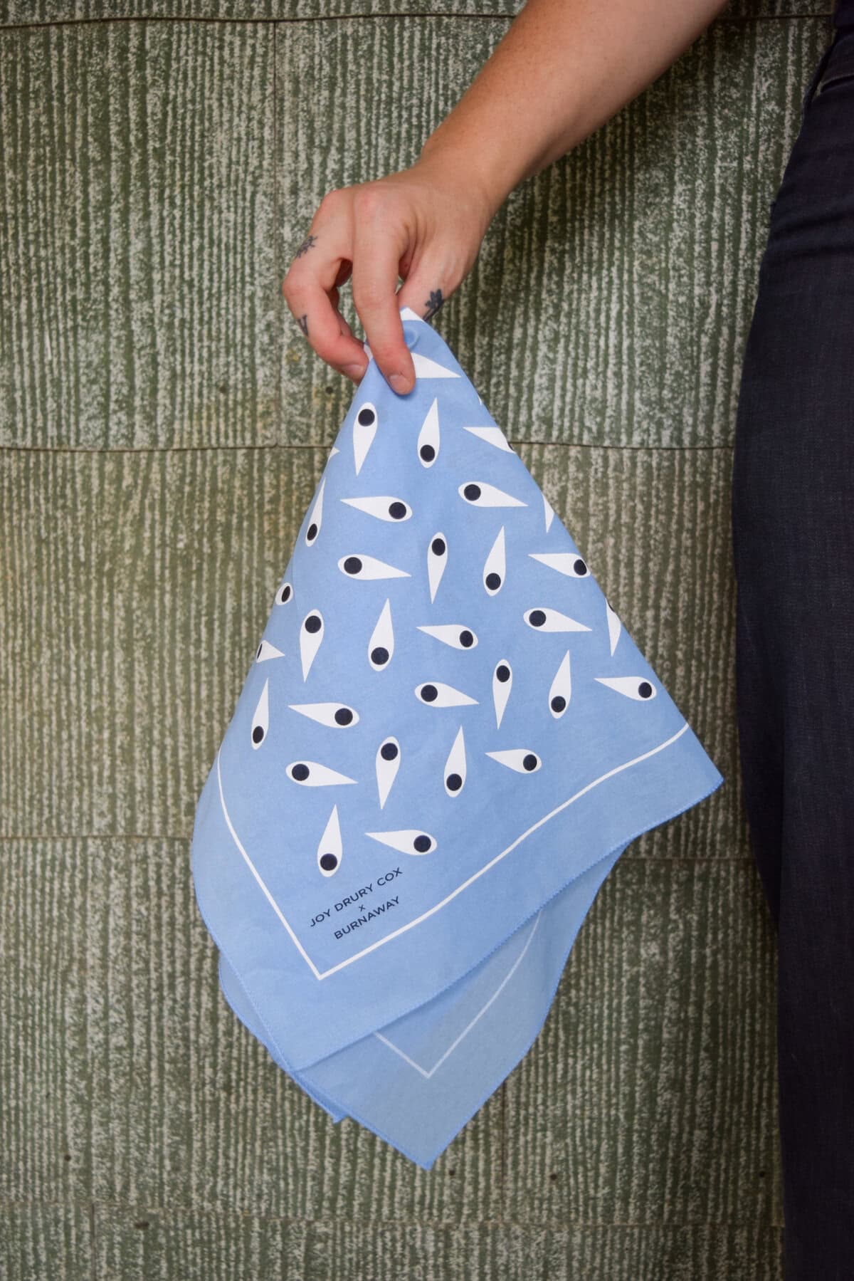 As part of Burnaway Artist Editions, Joy Drury Cox collaborated with Burnaway to design this limited edition bandana. She often appropriates mundane and bureaucratic structures in her artwork to critique their design and intended functions. Inspired by the design of a neighborhood crime watch sign, Cox reworked the icon of a single eye into a pattern, echoing the ways in which the act of looking itself can become a rigid, rote, and potentially harmful process. At the core of this work, Cox asks viewers to reconsider what and how we watch, look, and see the world.